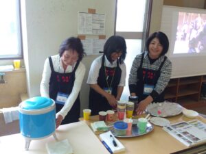 揃いのエプロンを身に着け、参加者に声掛けしてます。