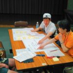第1視聴覚室内に3委員会ごとの”島”をつくり、用意したワークシートにアイデアを書いたカードを配置しながら、ディスカッションを勧めます。